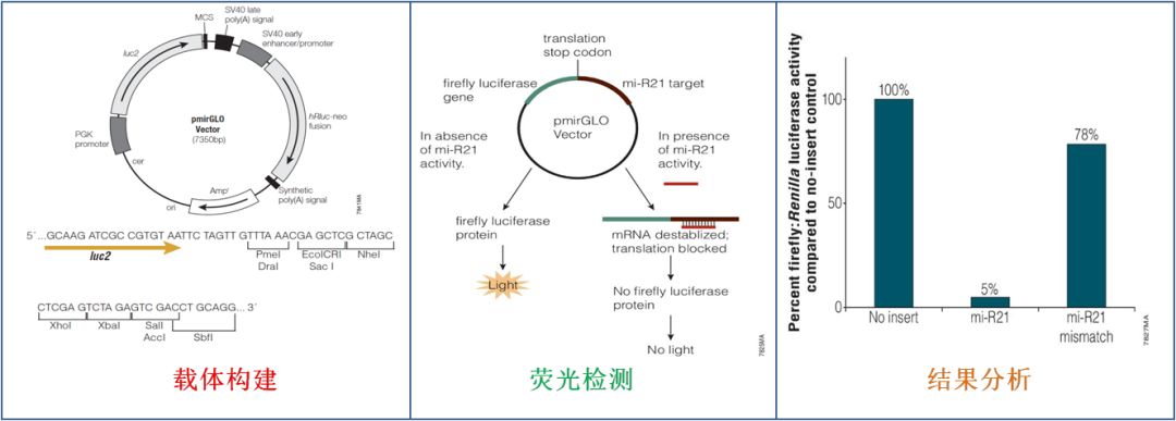 萤火虫荧光素酶报告基因为主要报告基因。若目的基因表达被抑制,则使萤火虫荧光素酶转录过程受阻,抑制萤火虫荧光素酶蛋白翻译,萤火虫荧光值下降,而作为标准化内参照的海肾荧光素酶的表达不受影响,此时萤火虫荧光素酶活性/海肾荧光素酶活性值下降,从而可以确定miRNA与靶基因是否具有直接调控作用。