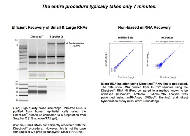 本方法无需传统 TRIZOL 提取方法的相分离,而且不需要使用任何有毒有害的试剂(例如氯仿),7 分钟就可完成整个操作步骤并且可以提取到含 microRNA 的总 RNA。